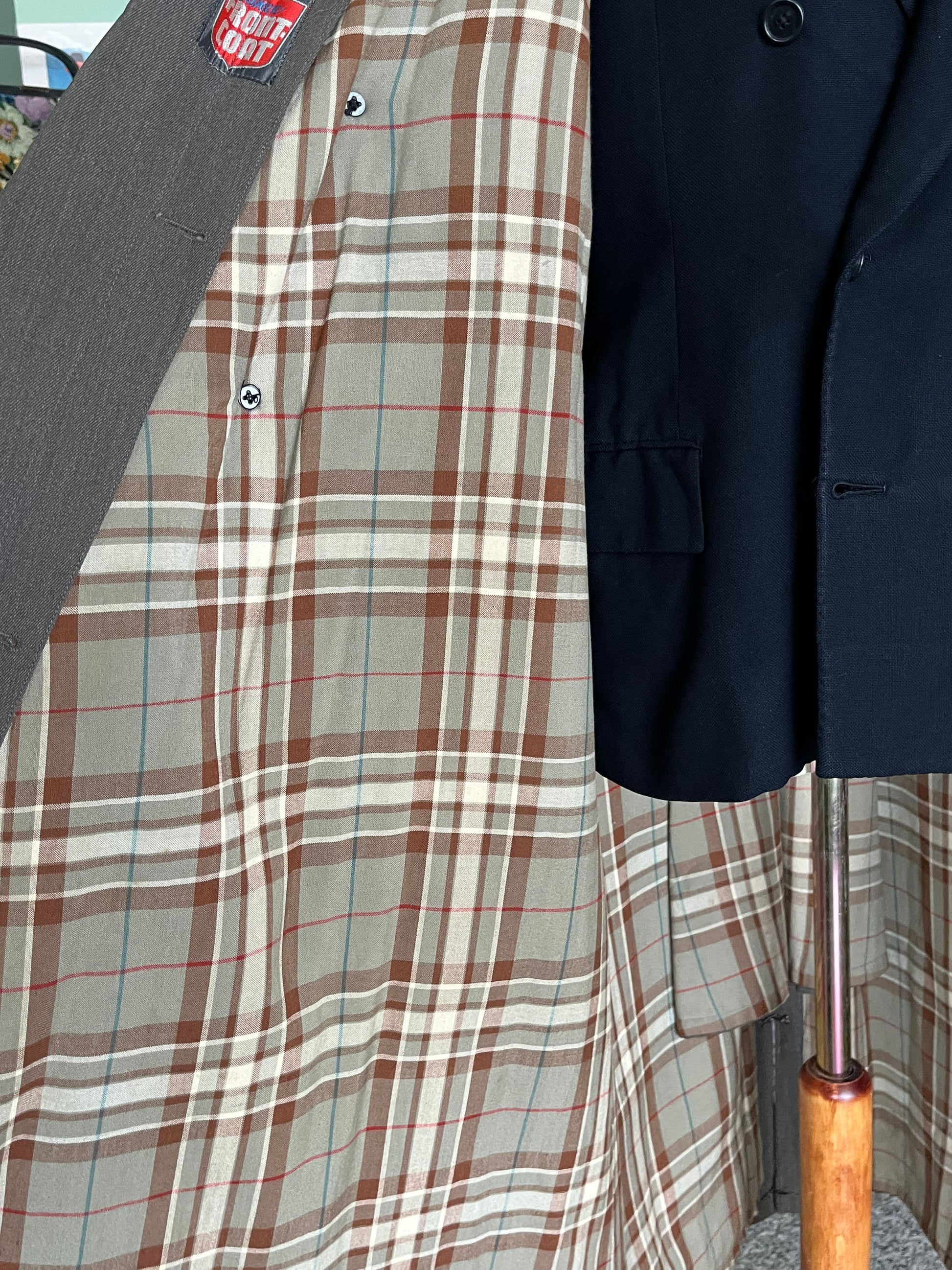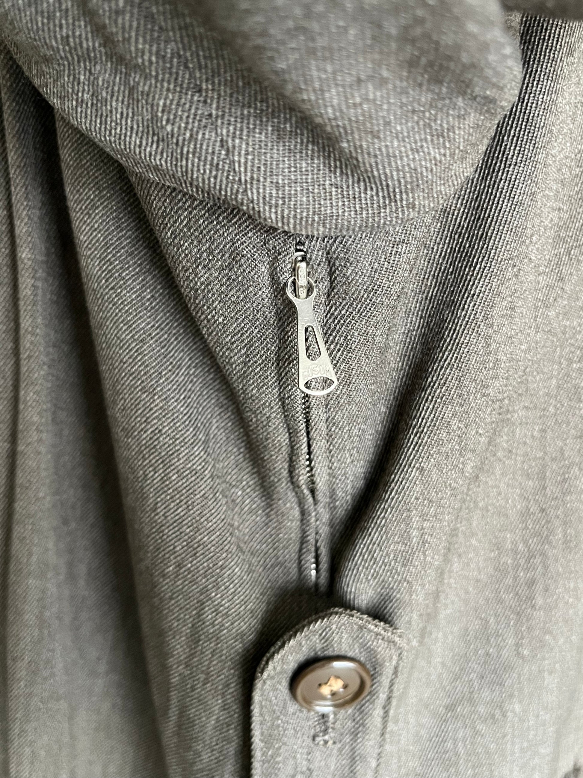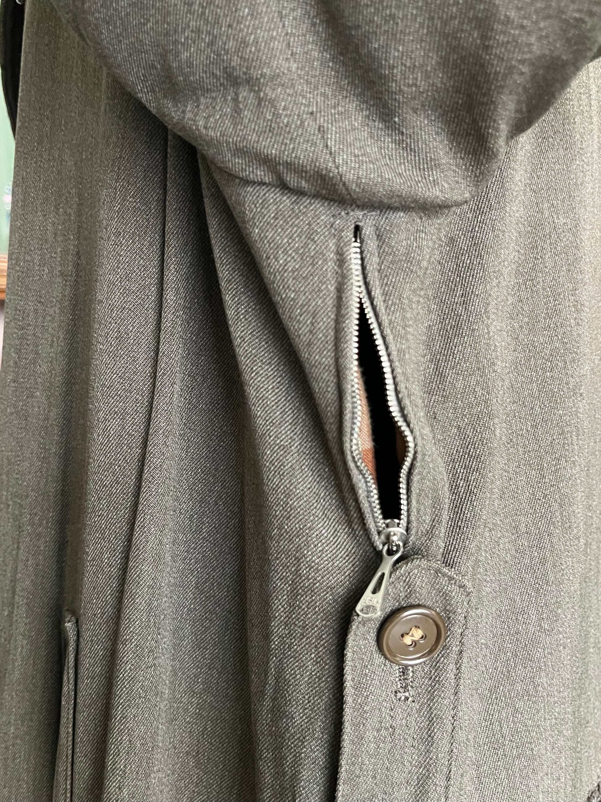 Il tessuto è uno stupendo gabardine di lana MOLTO pensate. Un tessuto totalmente scomparso dalla produzione di oggi e decisamente più pensate dei trench a cui siamo abituati (anche di quelli vintage).