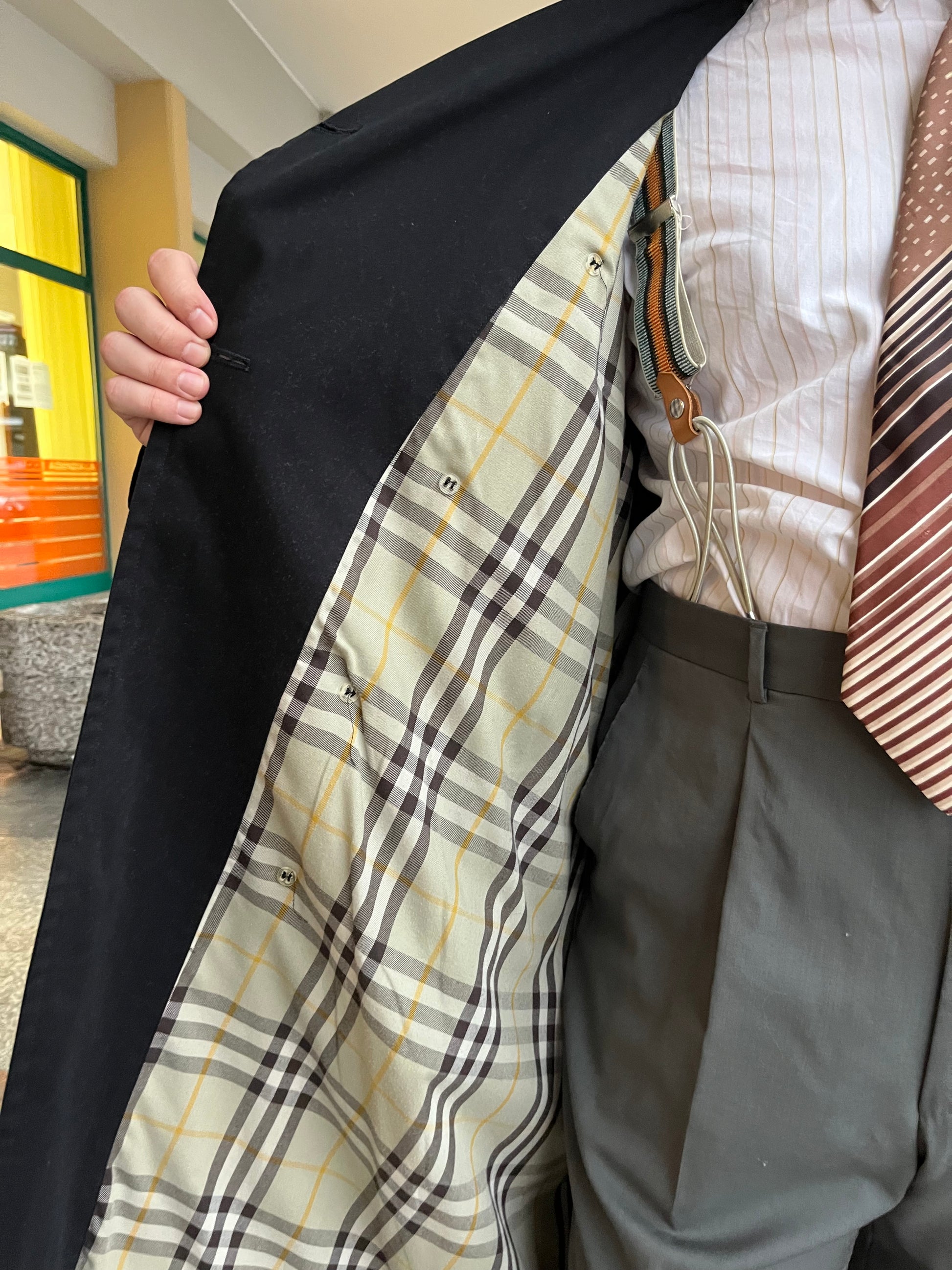 Il trench presenta abbottonatura doppiopetto, tasche di sbieco, cintura in vita, stringi-maniche, stringi-collo e spacco sul retro. Presenta tutti i dettagli del più classico dei trench.
