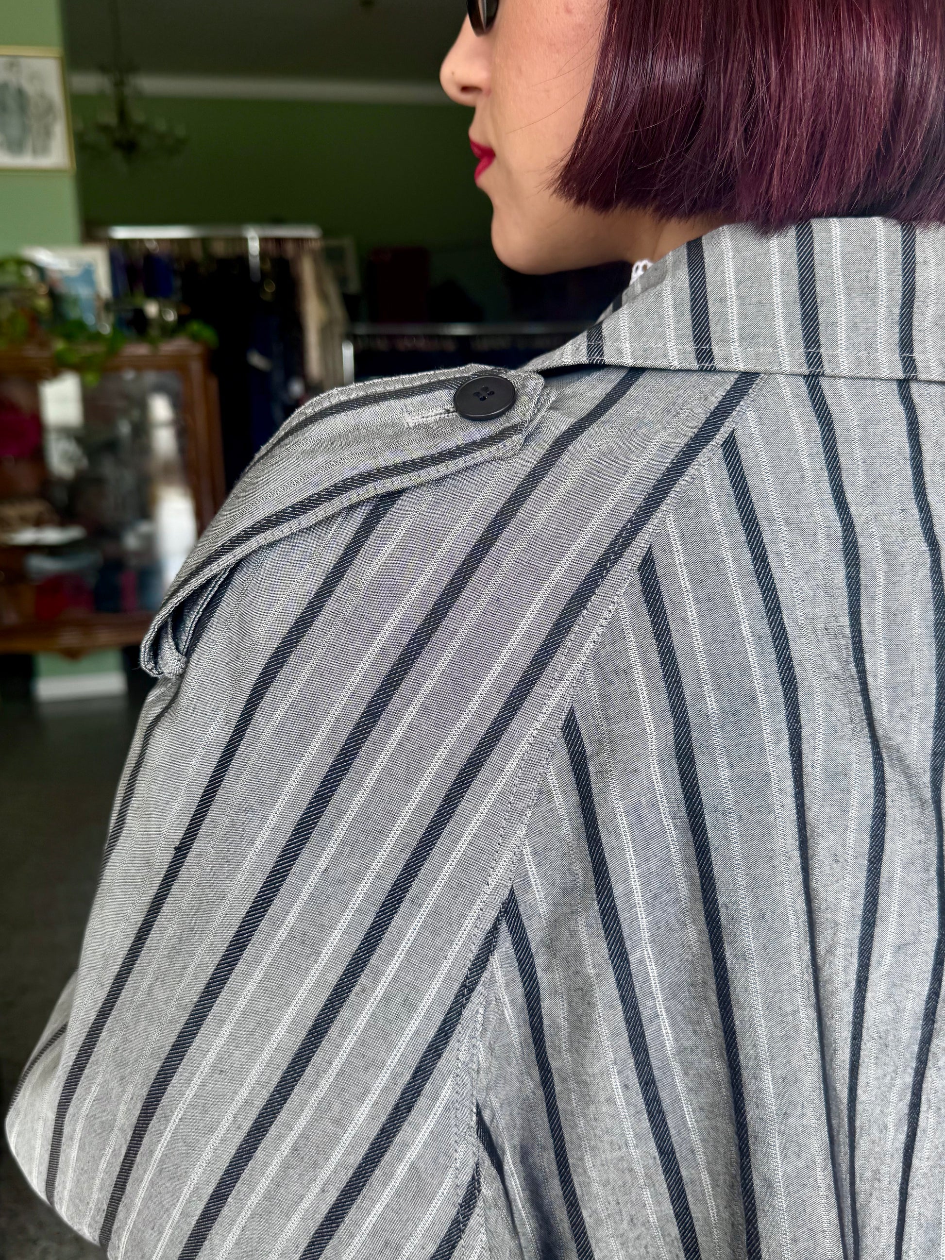 Un modello originale anni ‘80 e di grande carattere, in tessuto a righe verticali bianche e grigie. Linea classica arricchita dalla fantasia gessata, con cintura in vita e bottoni scuri a contrasto.