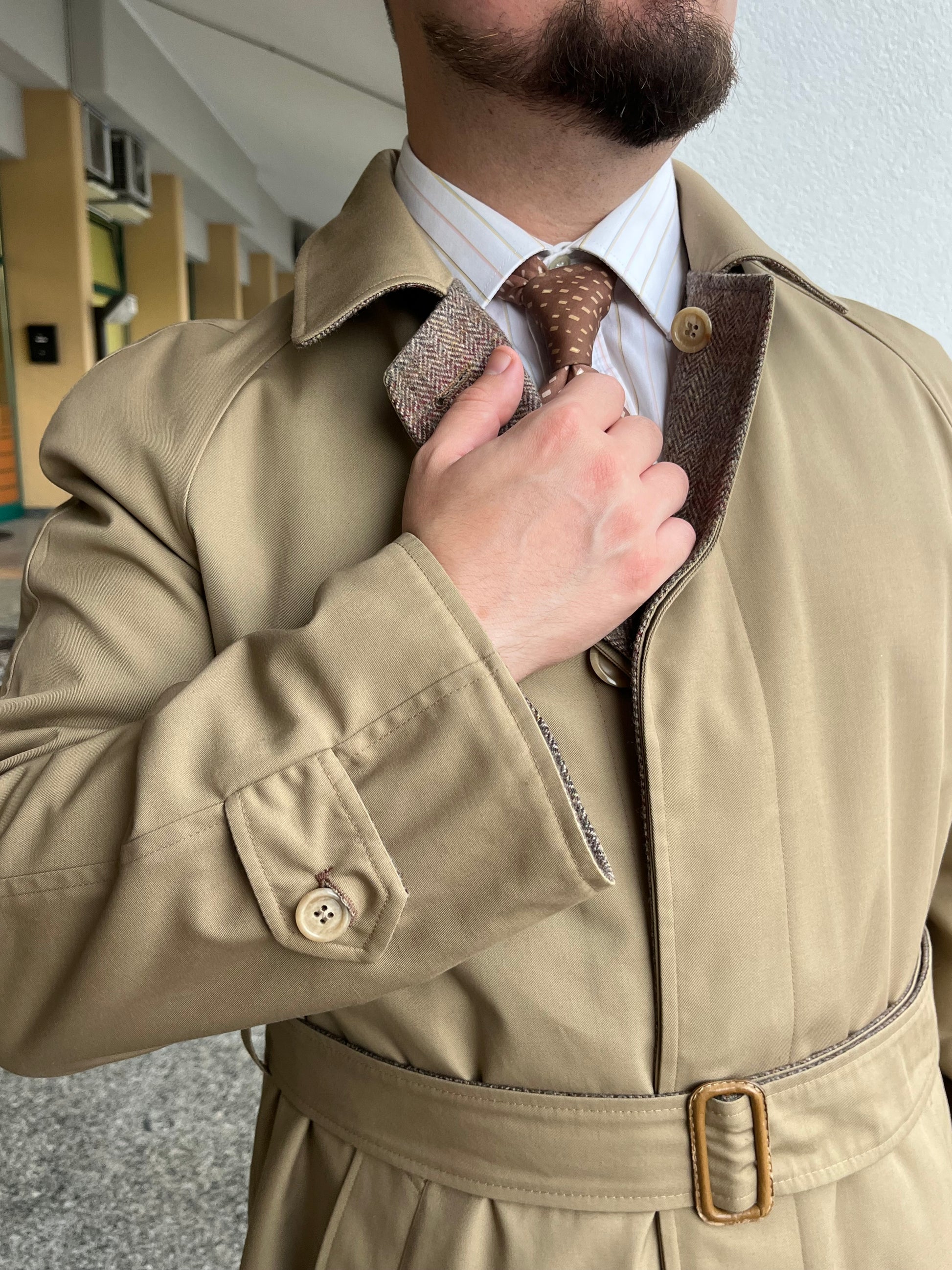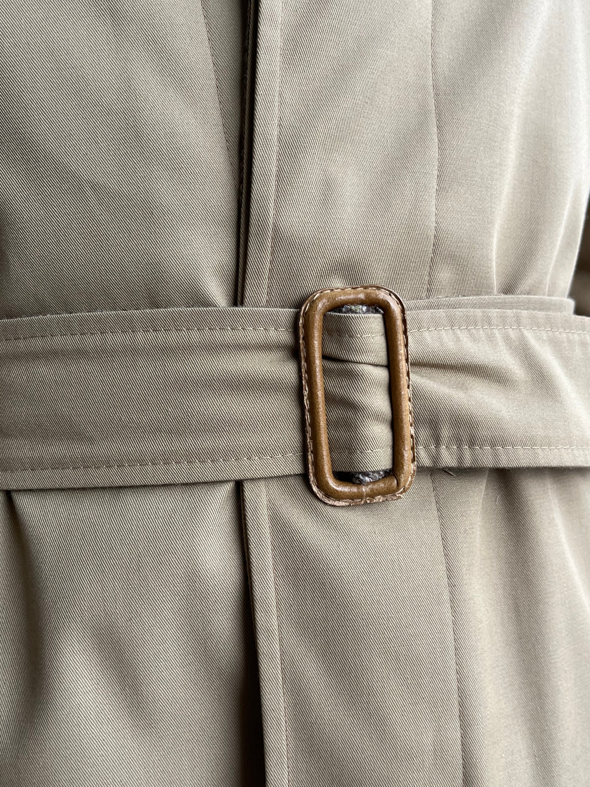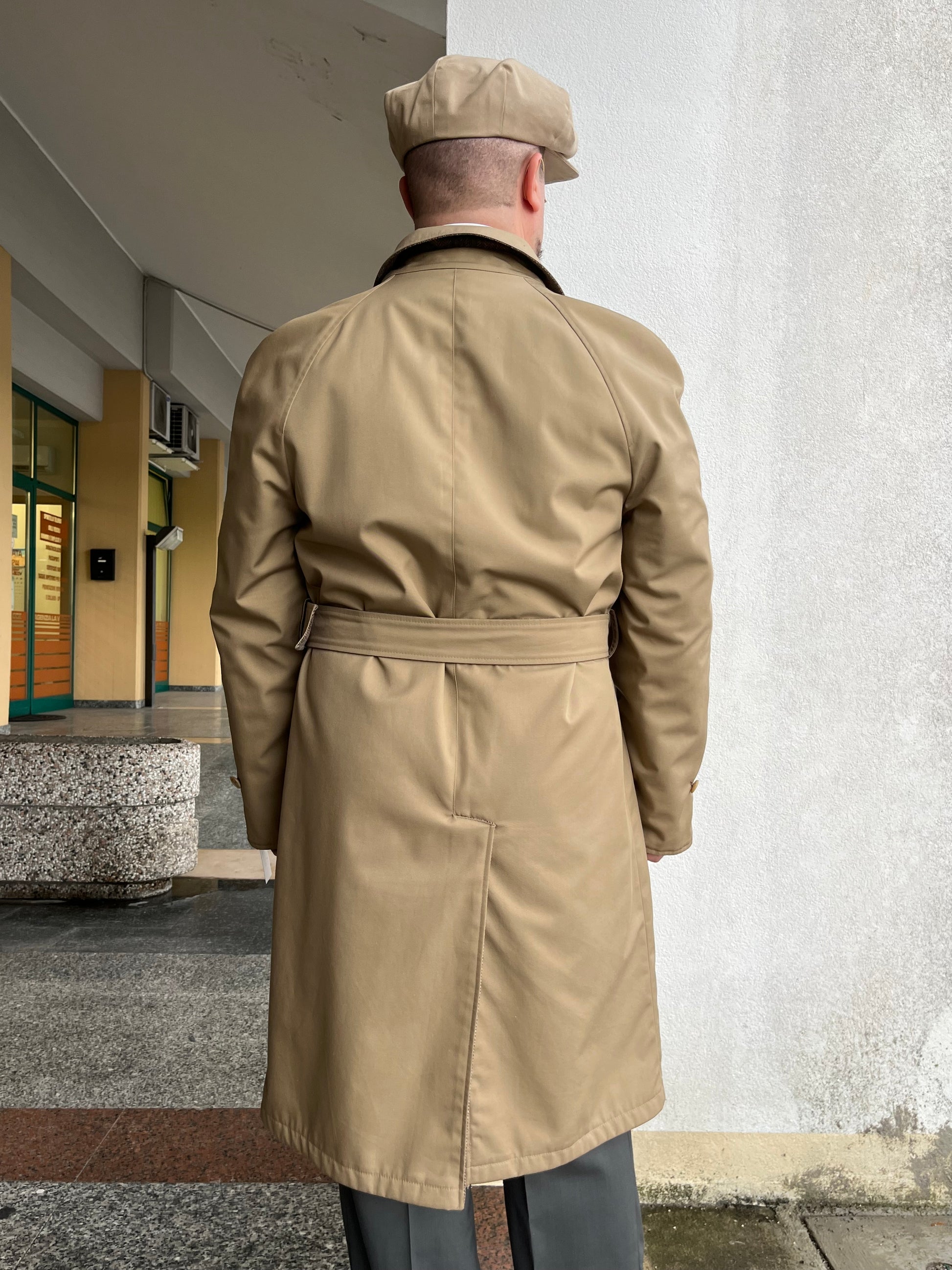 Stupendo trench anni ‘70 double-face in cotone impermeabilizzato e tweed, di colore beige.