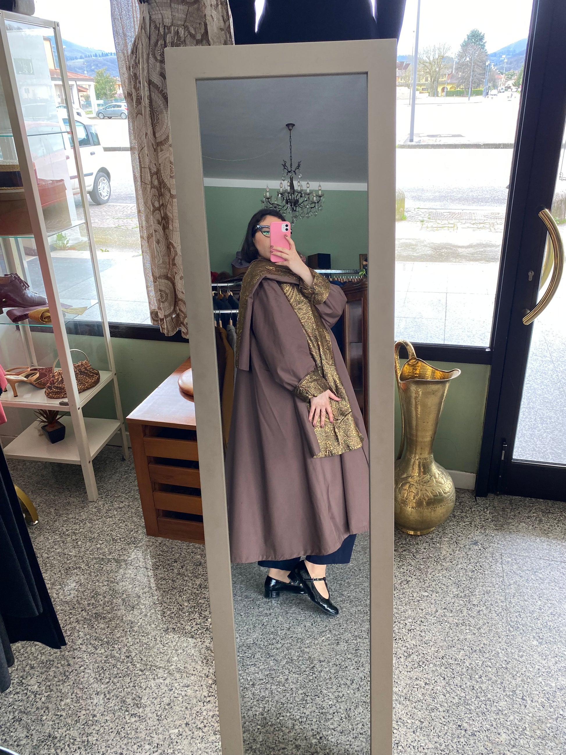 Il tessuto esterno è di un raffinato marrone cioccolato, un colore caldo e avvolgente che si sposa perfettamente con la fodera interna, vera protagonista del capo.