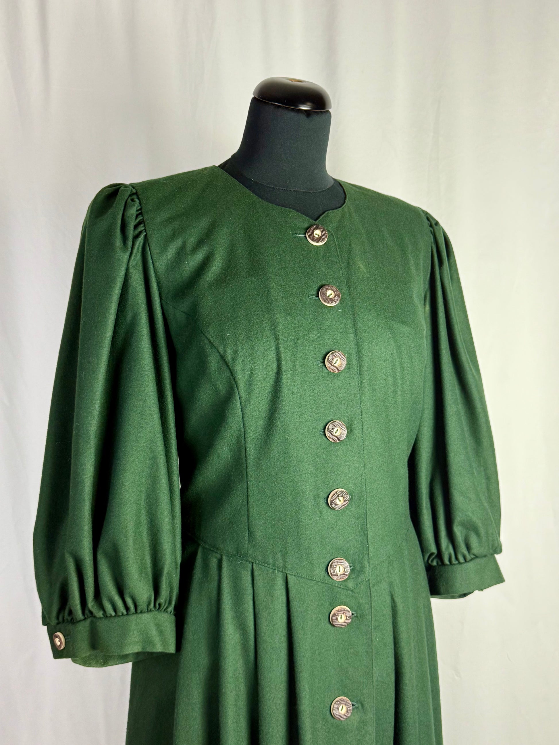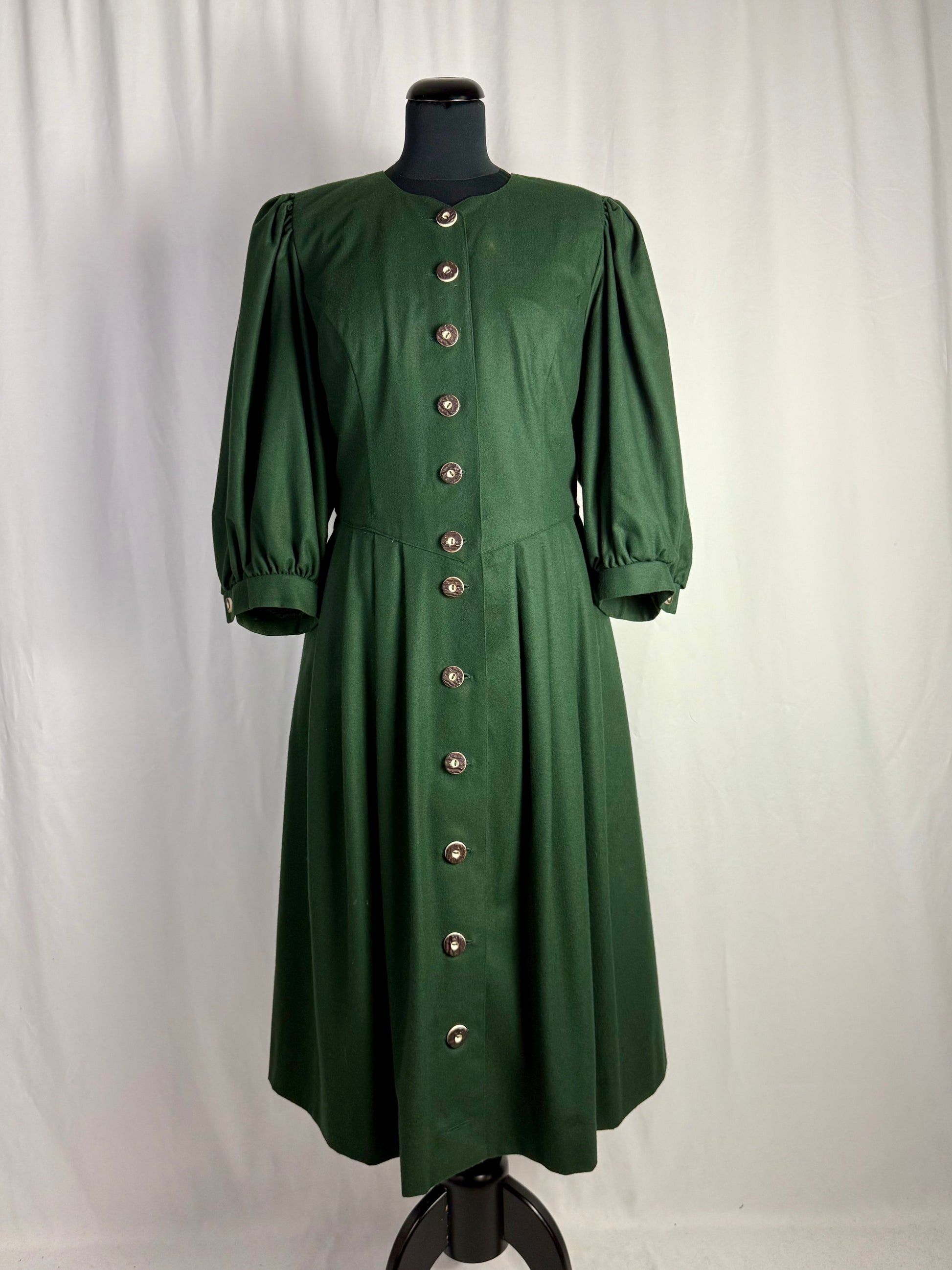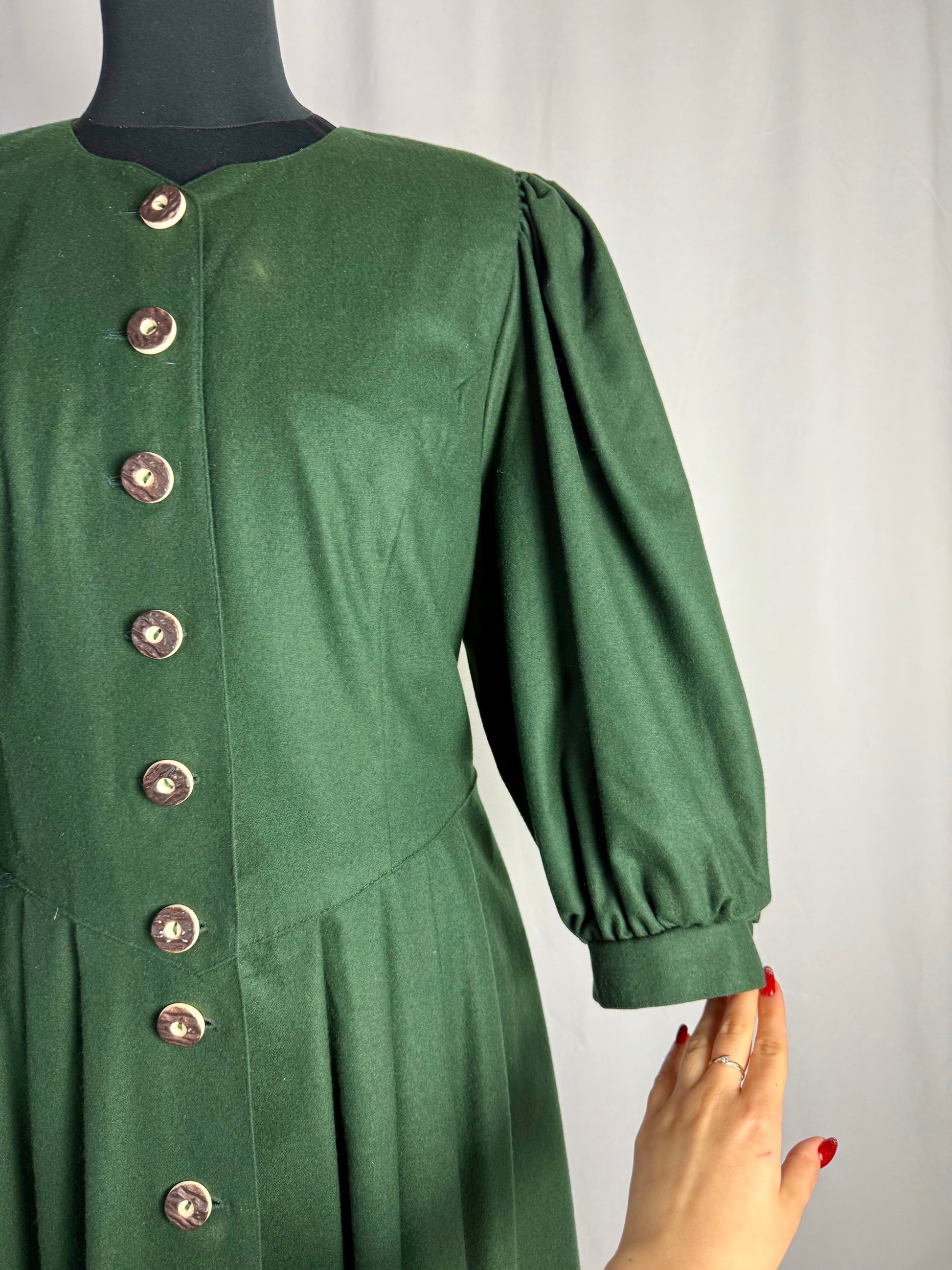 Abito tirolese vintage realizzato in pura lana, caratterizzato da linea romantica con vita sagomata e gonna ampia leggermente svasata. Chiusura frontale completa con bottoni in corno decorativi in stile tradizionale, applicati su paramontura centrale. Corpino strutturato con tagli sartoriali verticali che definiscono la silhouette. Maniche principesche con arricciatura alla testa e al polsino, rifinite con piccolo bottone.