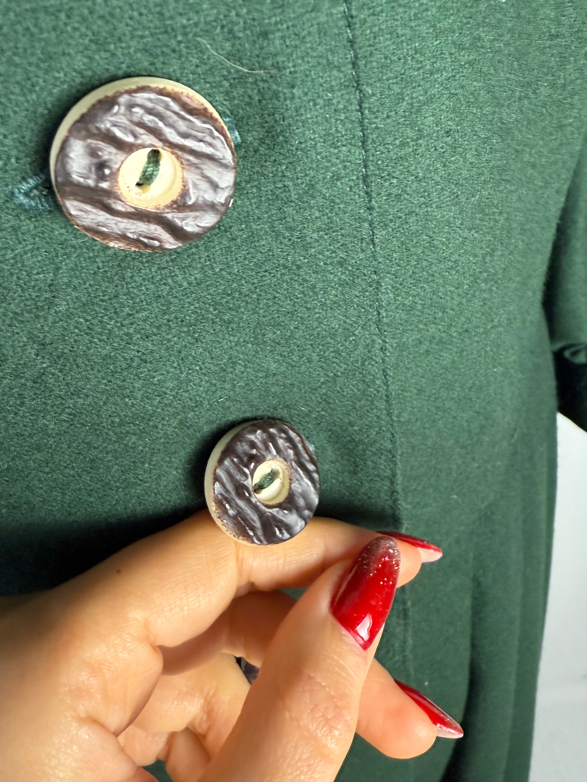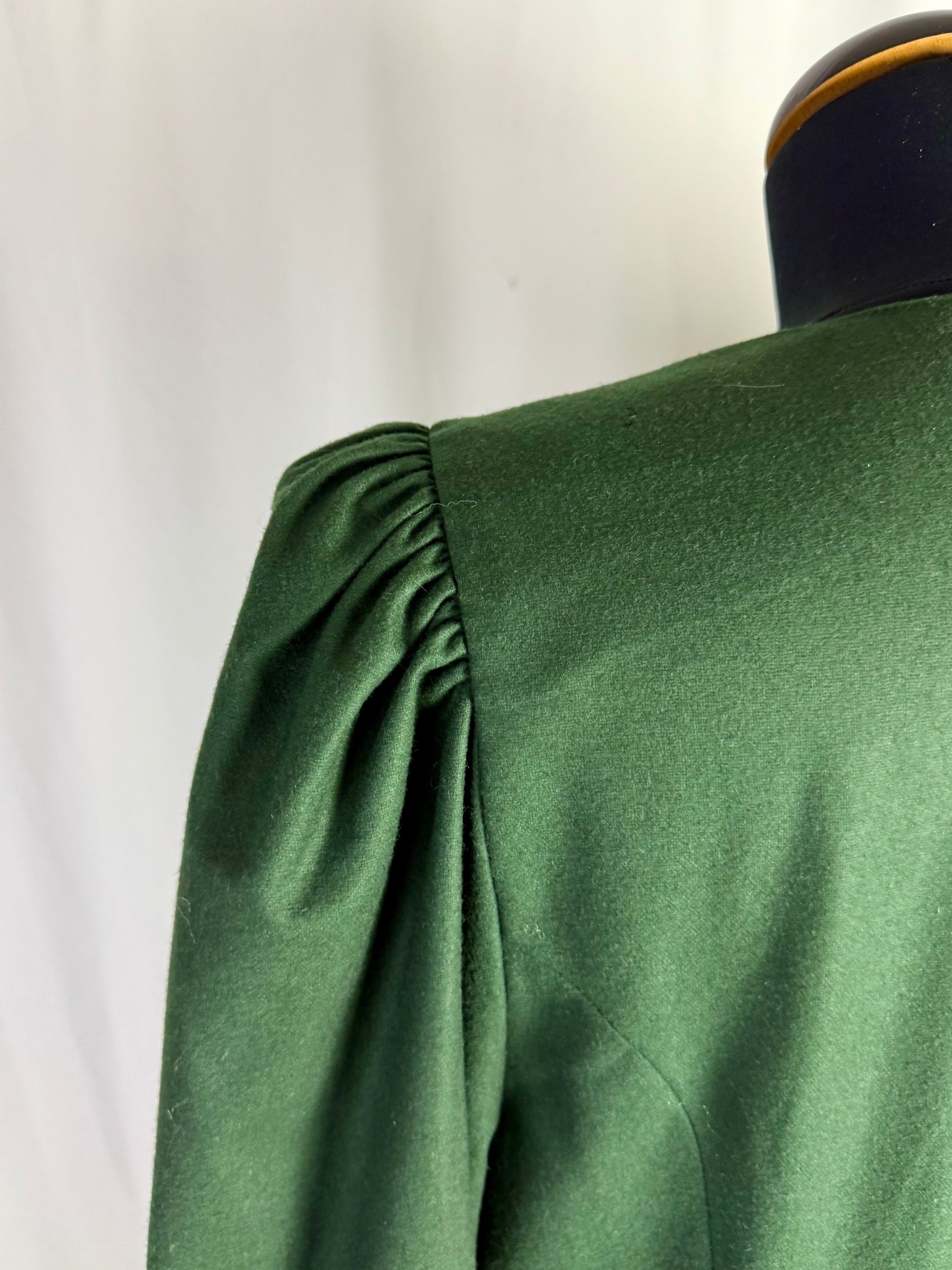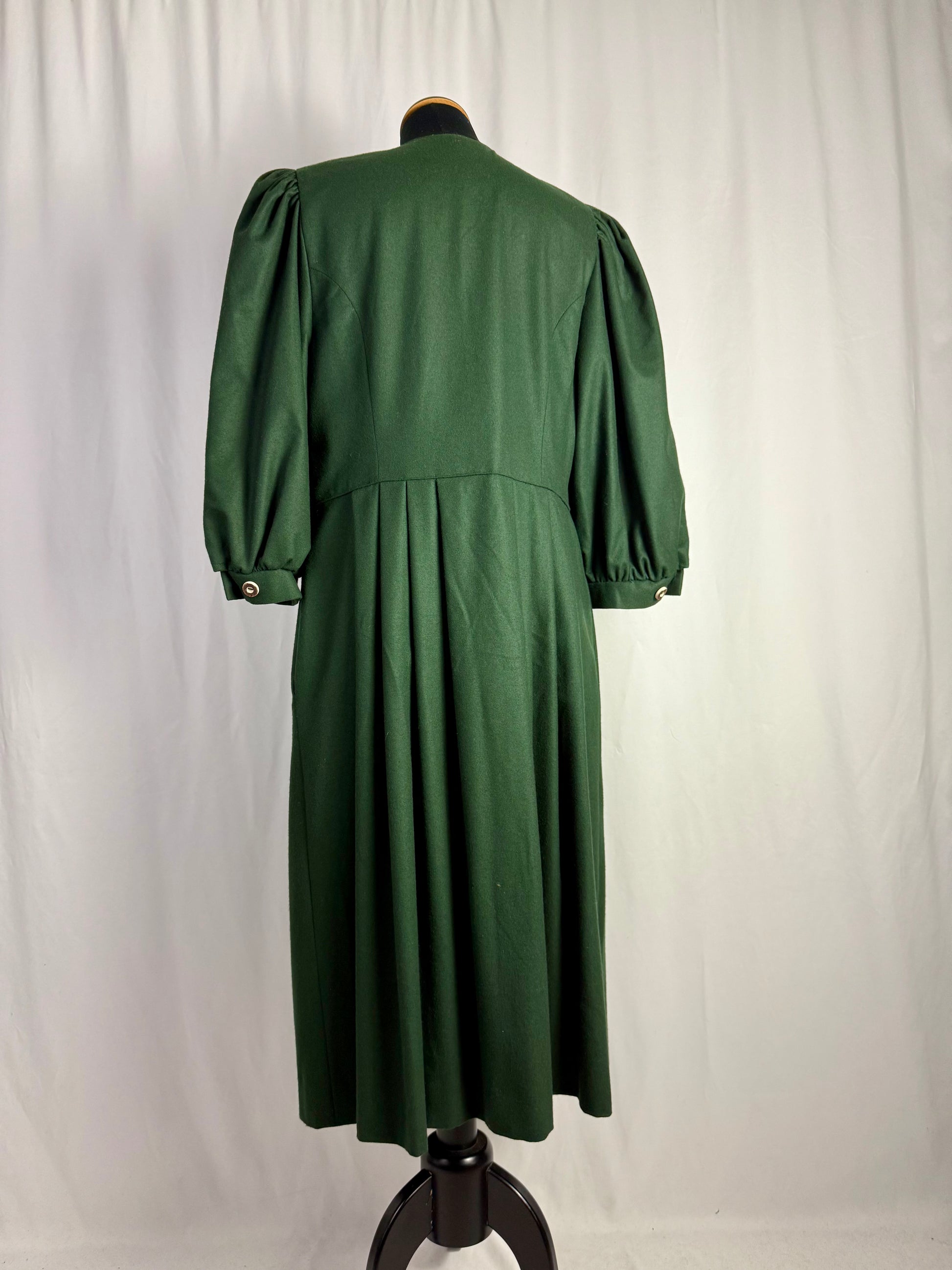 Abito tirolese vintage realizzato in pura lana, caratterizzato da linea romantica con vita sagomata e gonna ampia leggermente svasata. Chiusura frontale completa con bottoni in corno decorativi in stile tradizionale, applicati su paramontura centrale. Corpino strutturato con tagli sartoriali verticali che definiscono la silhouette. Maniche principesche con arricciatura alla testa e al polsino, rifinite con piccolo bottone.