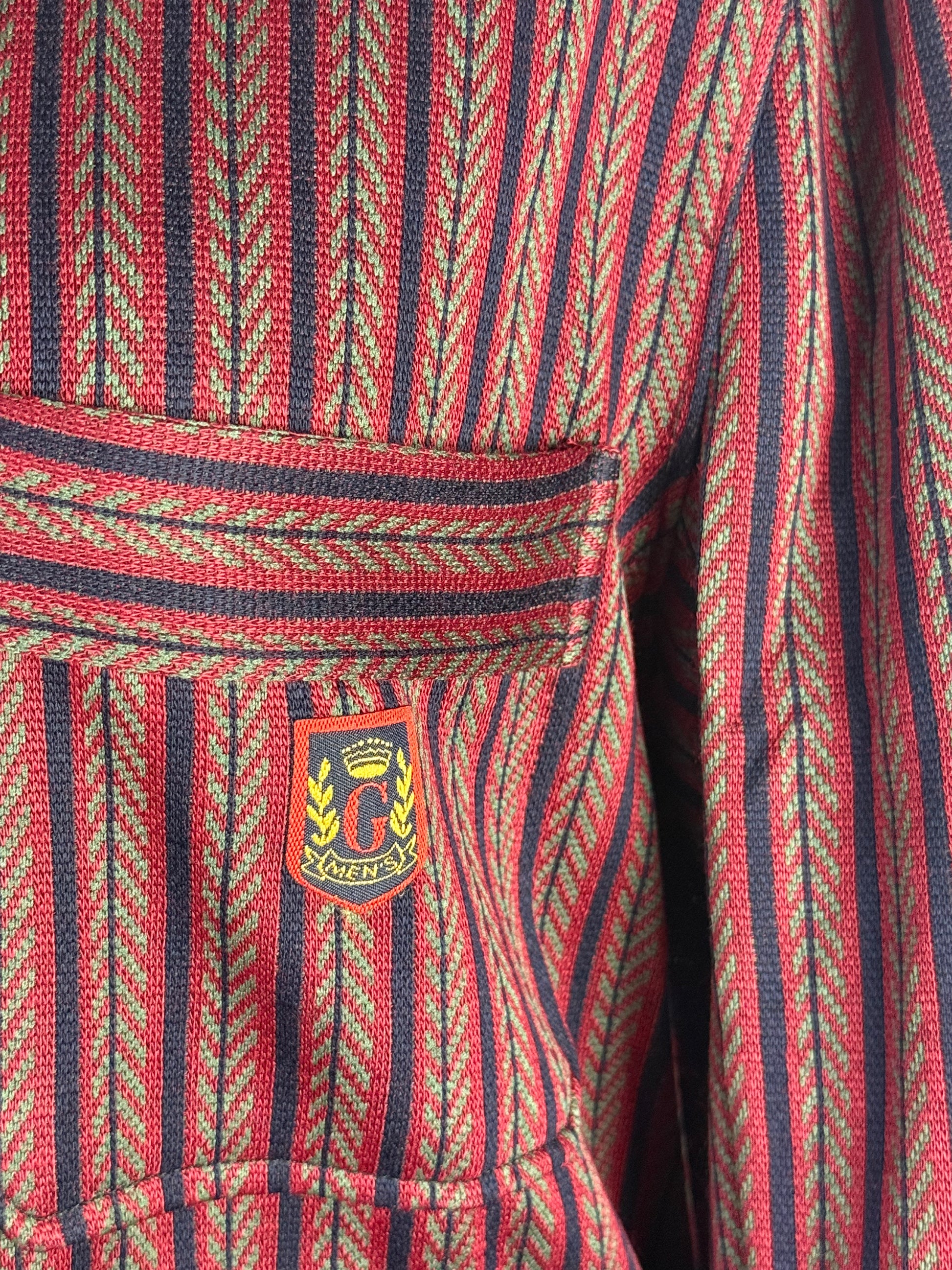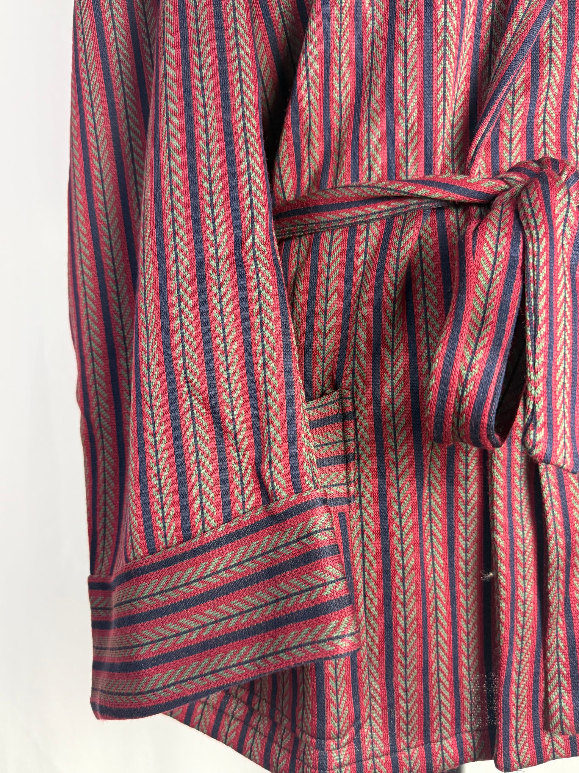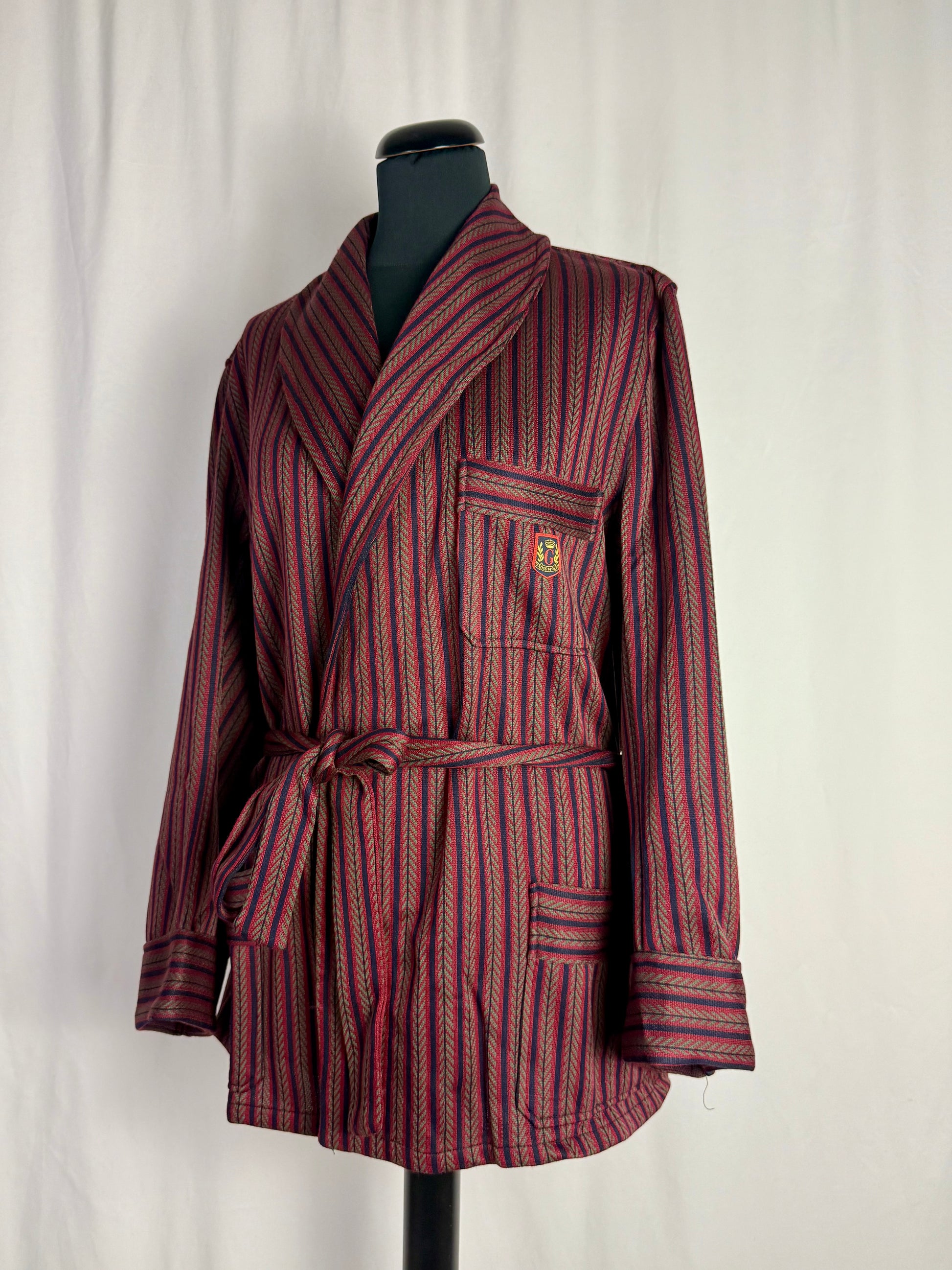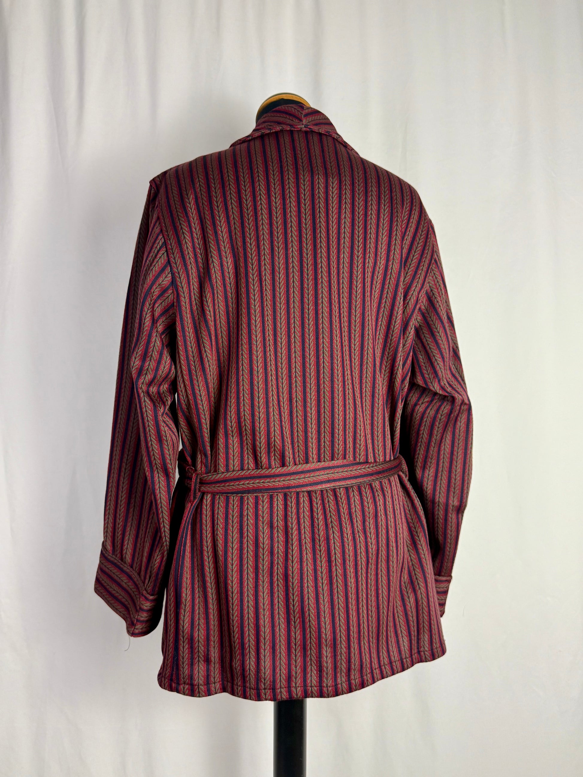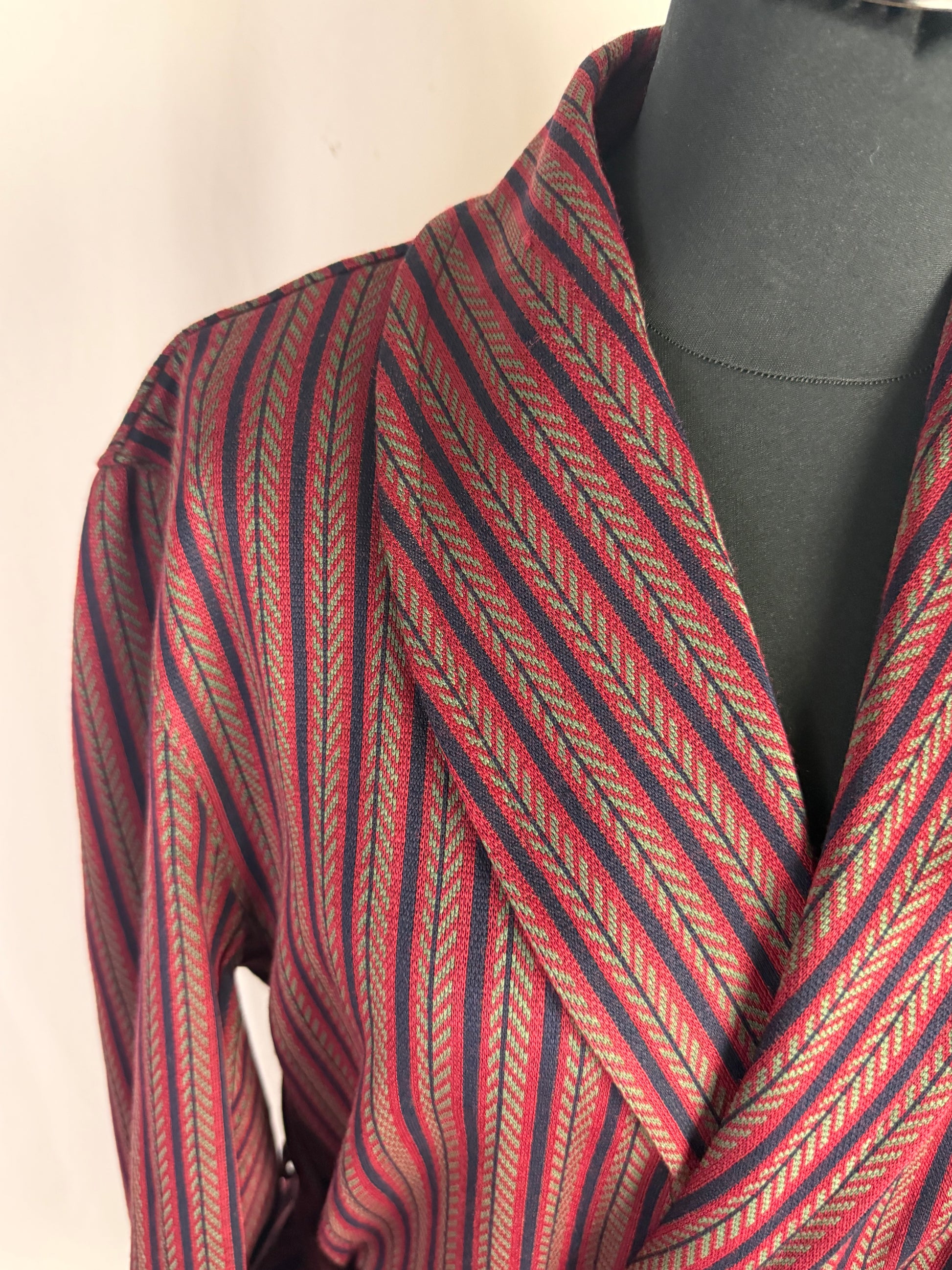 Giacca da camera nuova fondo di magazzino, realizzata in tessuto jacquard a righe verticali multicolore nei toni del bordeaux, verde e blu, con motivo a spina di pesce intrecciato. Modello con collo a scialle ampio, maniche lunghe con polsino dritto, chiusura frontale a portafoglio con cintura coordinata cucita in vita, due tasche applicate sul davanti e una tasca applicata sul petto con piccolo stemma ricamato.