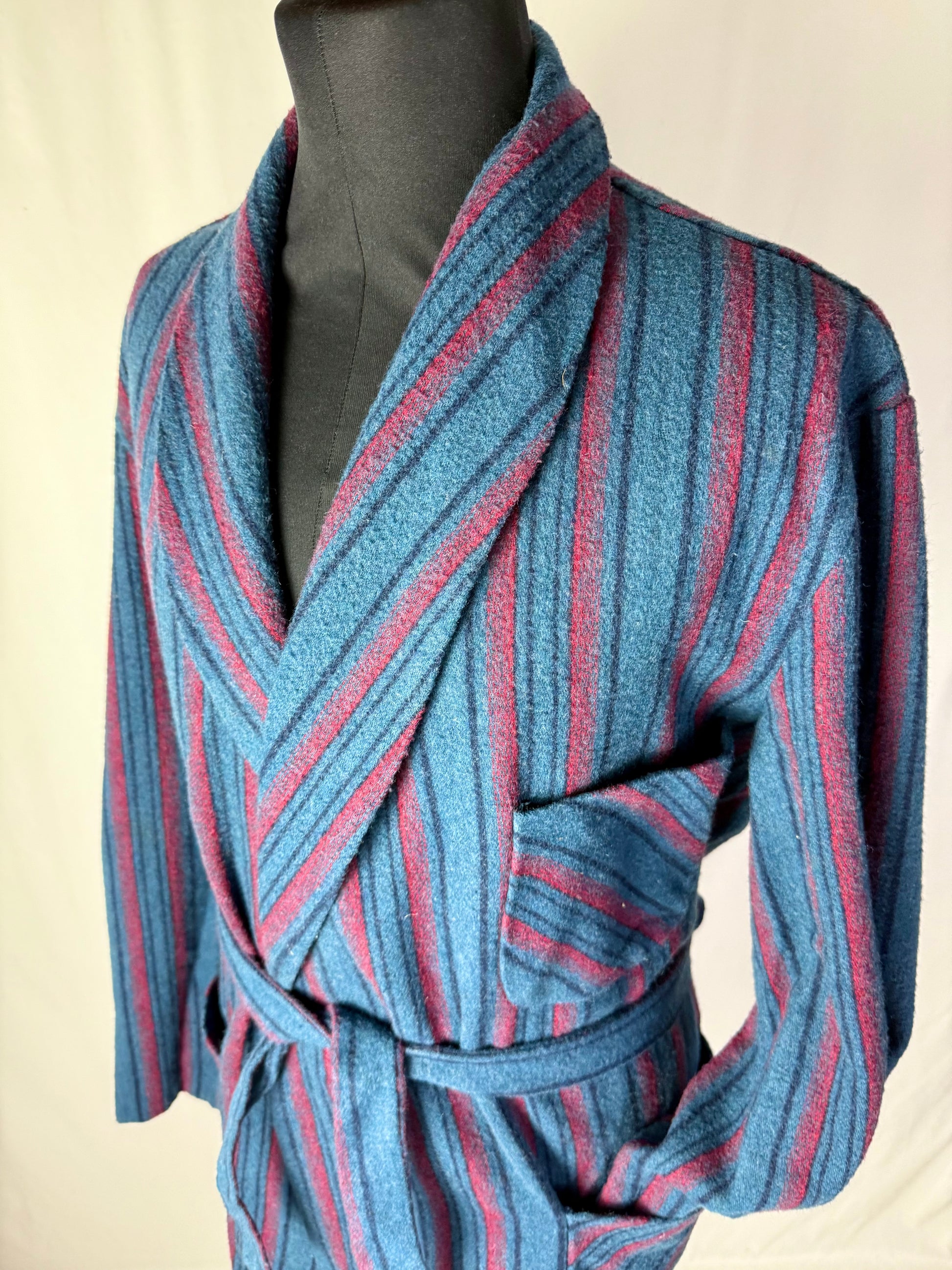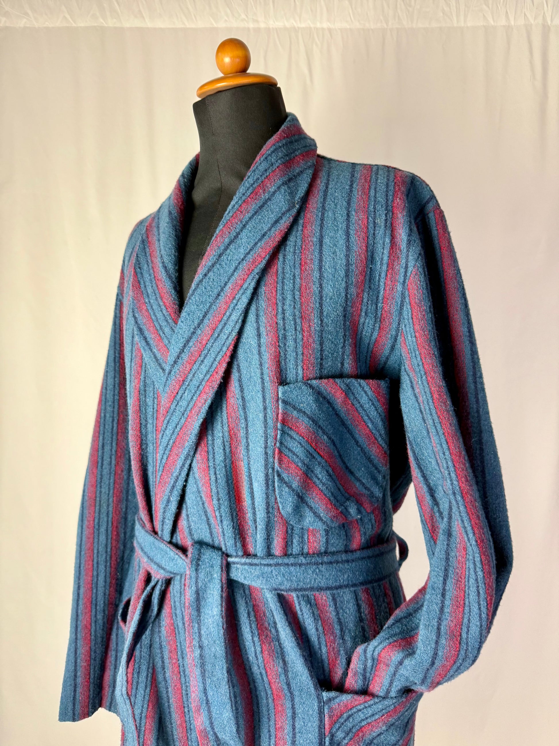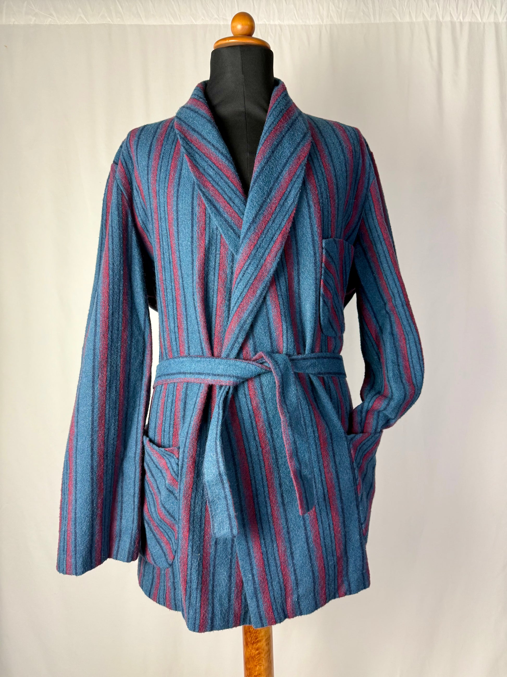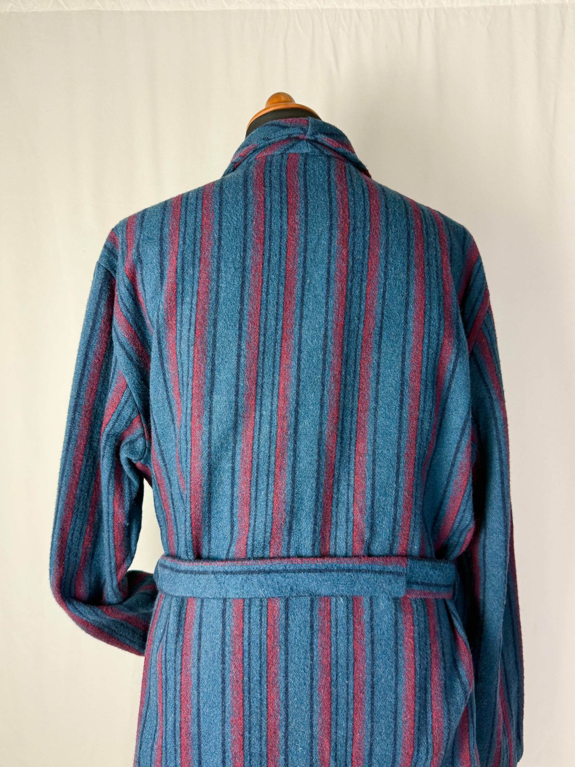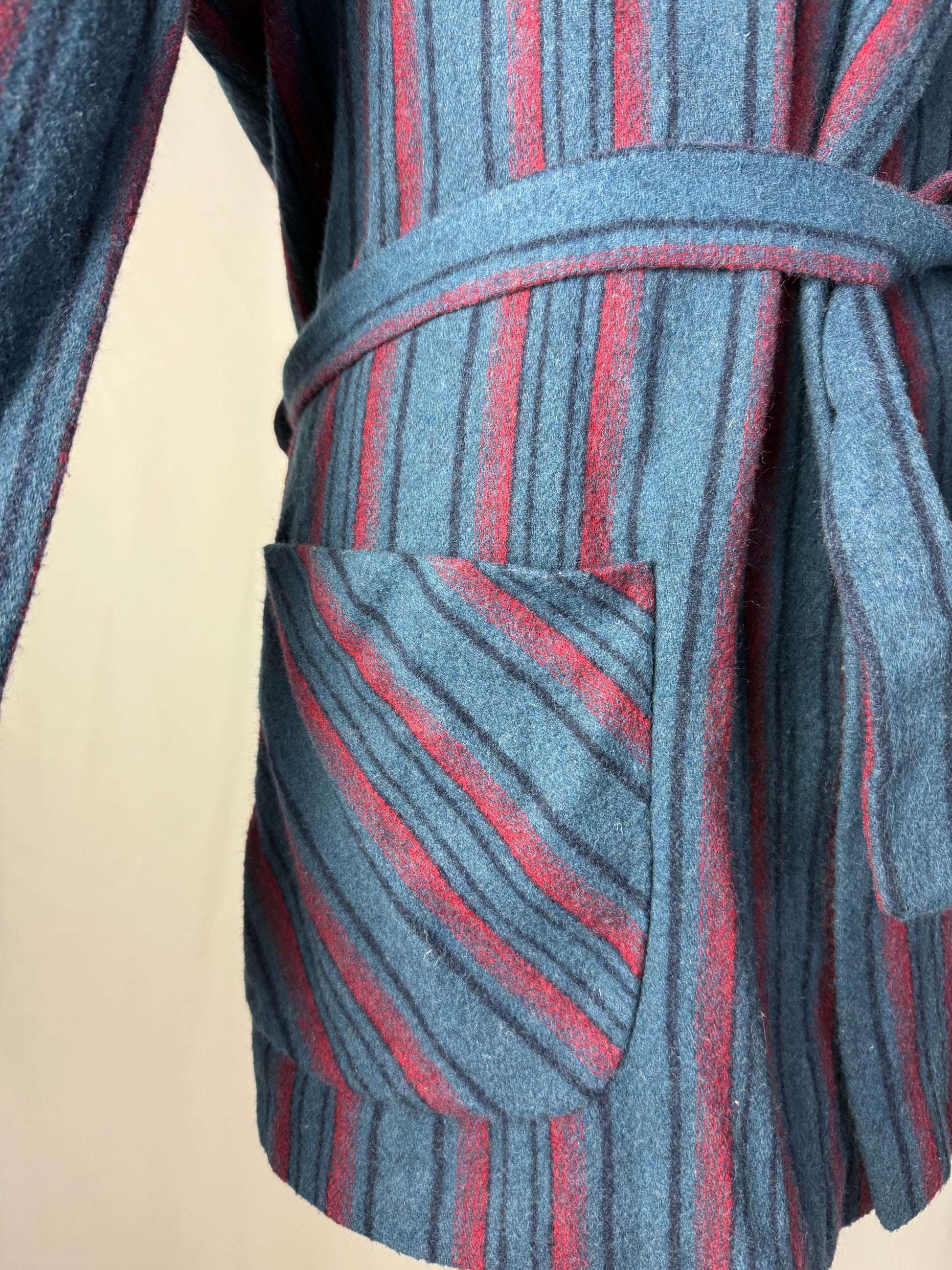 Caratterizzata da righe verticali blu e magenta, questa giacca è un pezzo vintage caldo e ricercato. Il taglio morbido e la cintura in tessuto coordinato la rendono ideale per chi ama capi unici e avvolgenti.